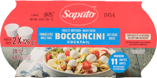 Saputo bocconcini are small balls of fresh, stretched-curd cheese, tender and delicate. Their mild flavor and soft texture make them an essential ingredient for salads, pasta, pizzas, antipasti, or sandwiches. Presented in a duo pack (2 x 126 g), they are perfect for convenient everyday use.