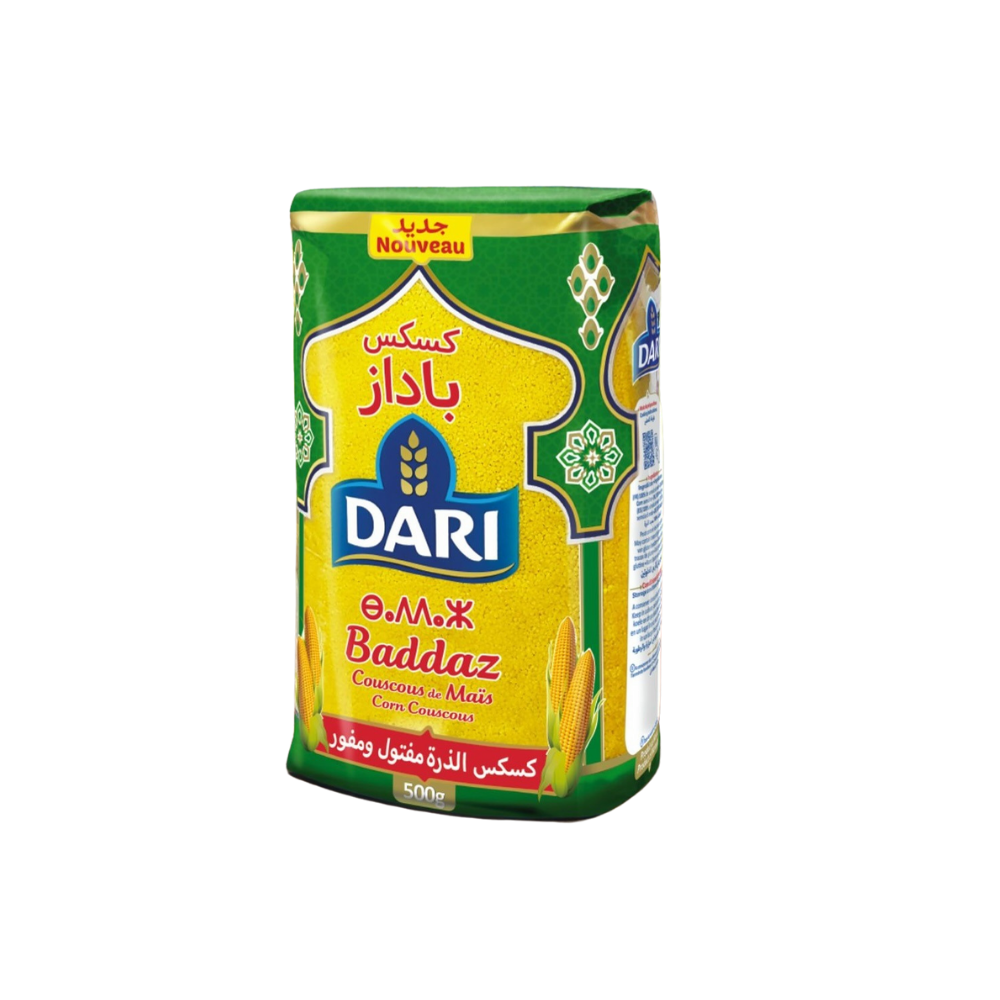 Le couscous maïs Baddaz Dari est une semoule traditionnelle 100 % maïs, appréciée pour sa couleur dorée naturelle, sa texture légère et son goût doux. Très utilisé dans la cuisine marocaine et berbère, il convient parfaitement pour les couscous, plats mijotés, salades, accompagnements ou recettes sans blé.