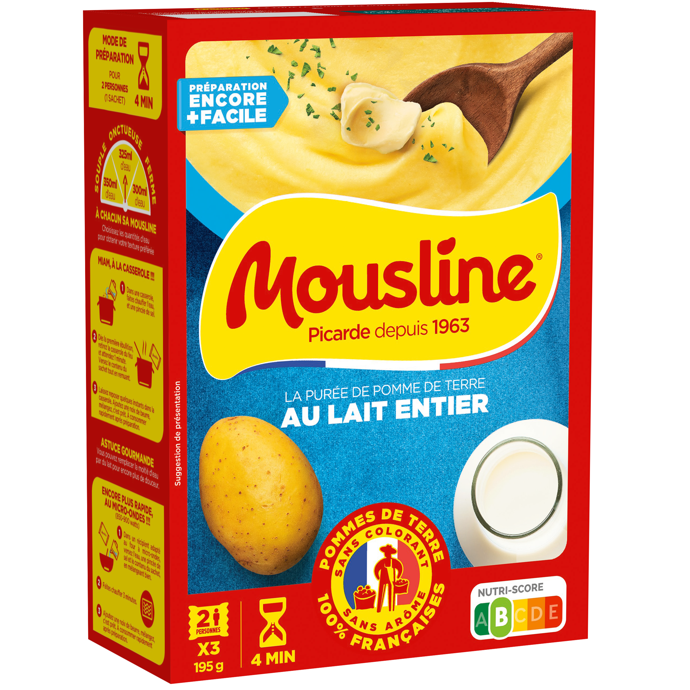 Mousline Cream & Whole Milk Purée offers an even creamier texture thanks to the addition of whole milk and cream , for a rich and comforting taste. Easy to prepare, it is a quick and tasty accompaniment to your meats, vegetables or stews.