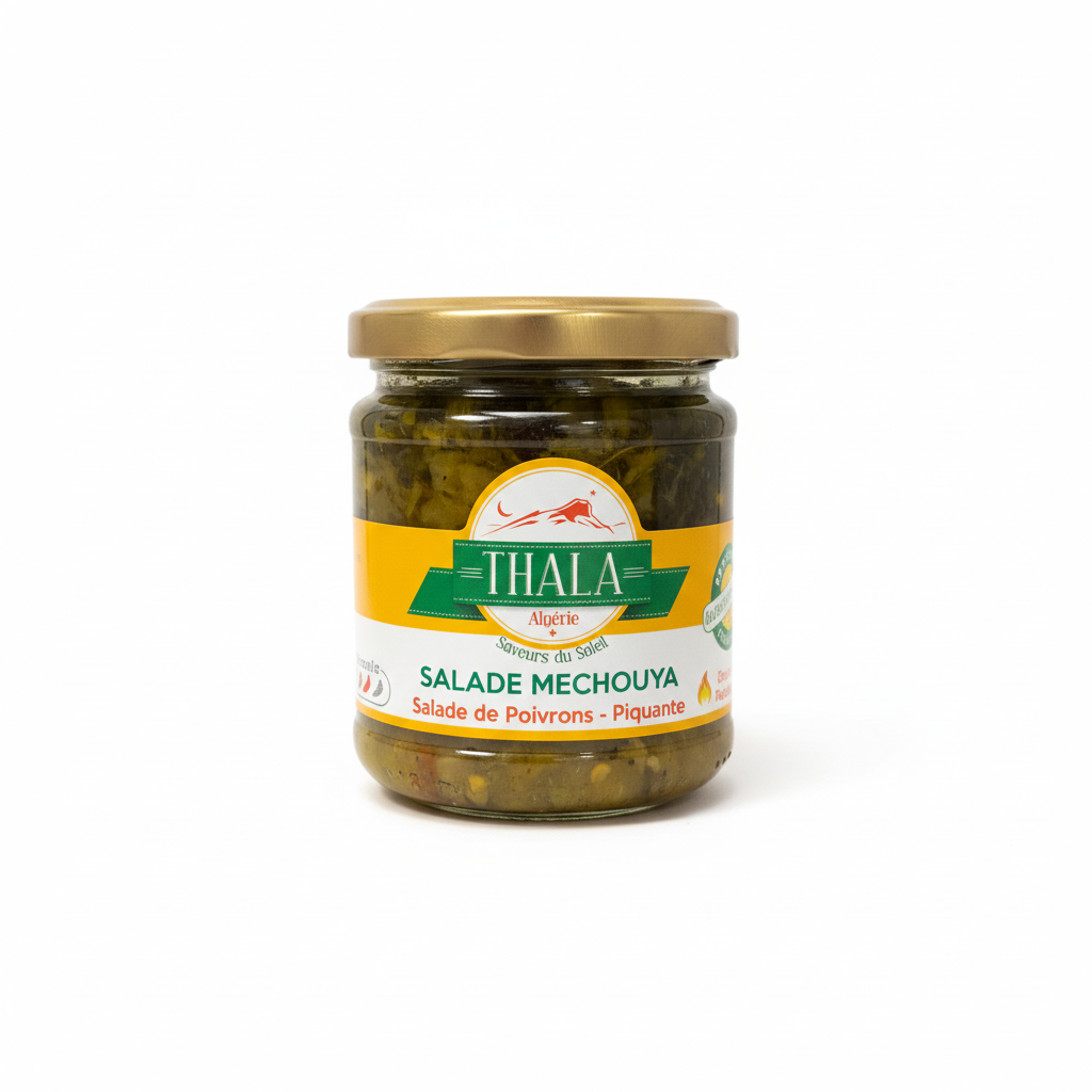 La Salade mechouya Thala est une préparation traditionnelle algérienne qui célèbre les saveurs authentiques de la Méditerranée. À base de poivrons grillés, cette salade offre un équilibre parfait entre douceur fumée et notes épicées relevées.